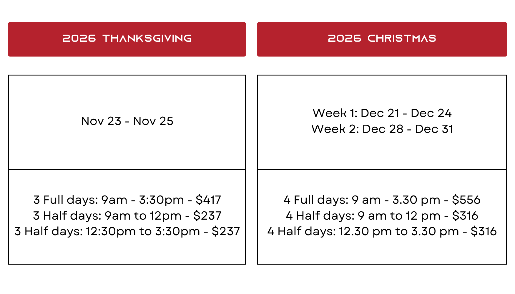 Extended daycare available from 3.30pm to 6pm if needed. $20/hr.